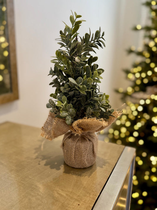 Mini Frosted Eucalyptus Tree – 25cm Rustic Winter Tabletop Decoration with Burlap Base