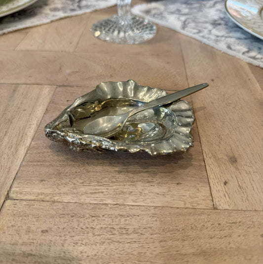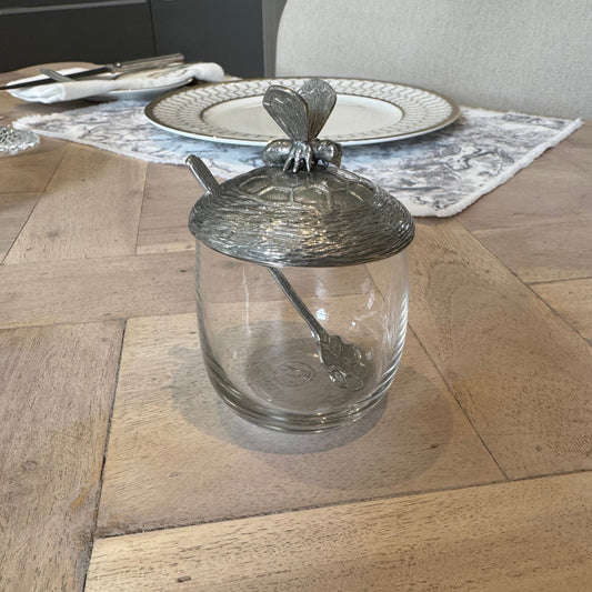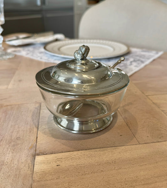 Honey Pot with Lid and Spoon in Pewter and Glass