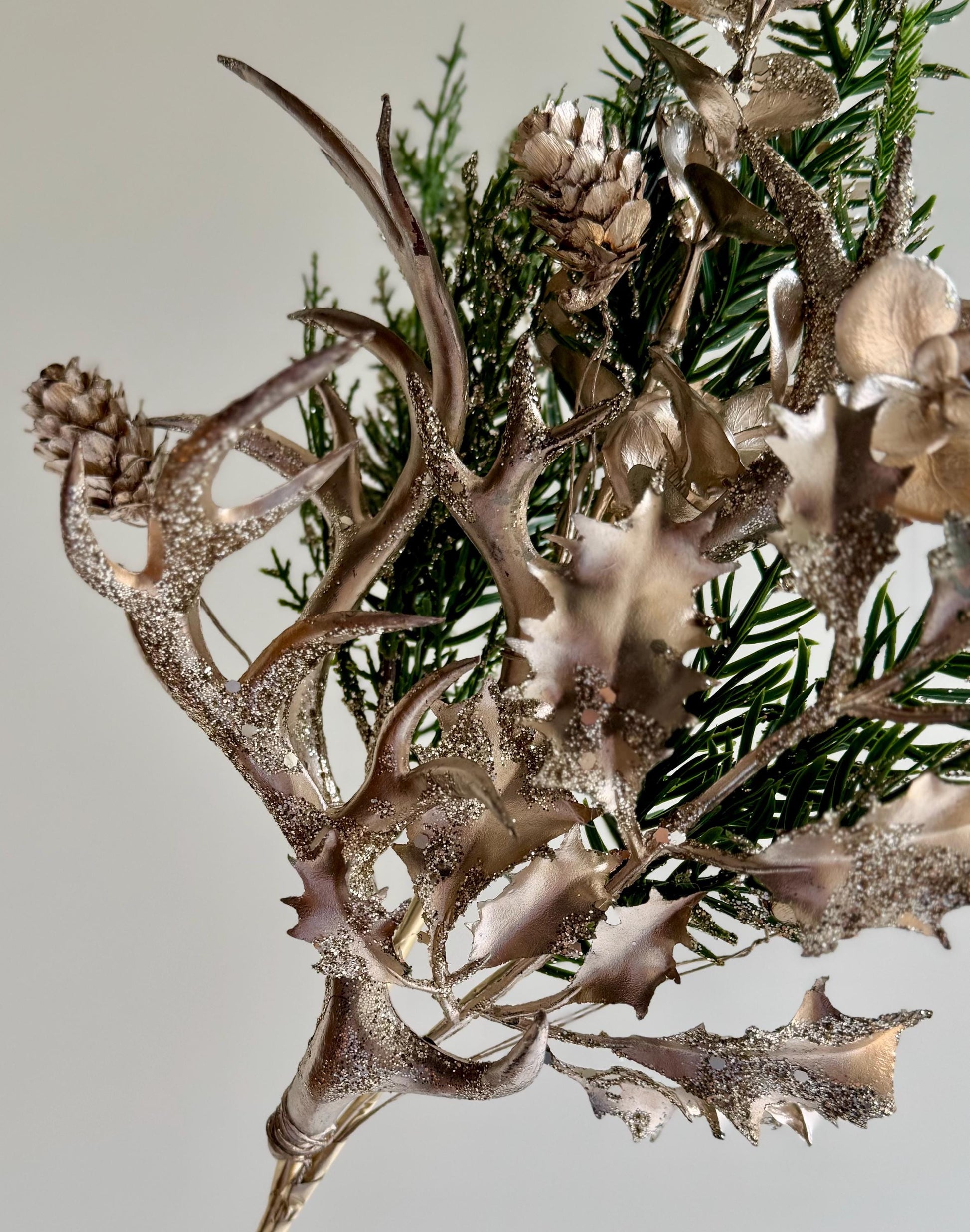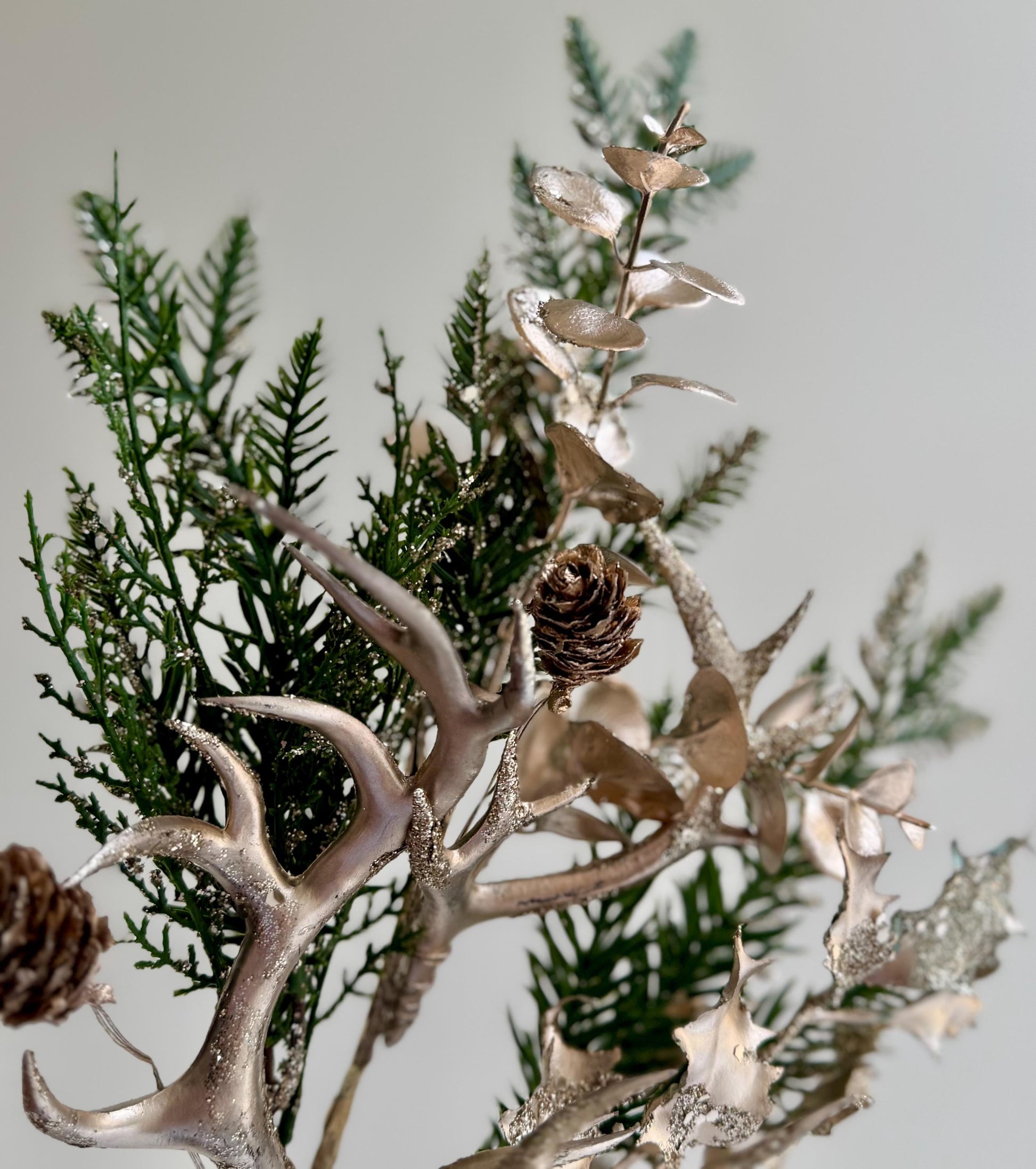 Bring a touch of winter elegance to your home with our Champagne Sparkle Antler Spray, a beautifully detailed festive stem combining champagne-toned antlers, glittered foliage, pinecones, and eucalyptus leaves.