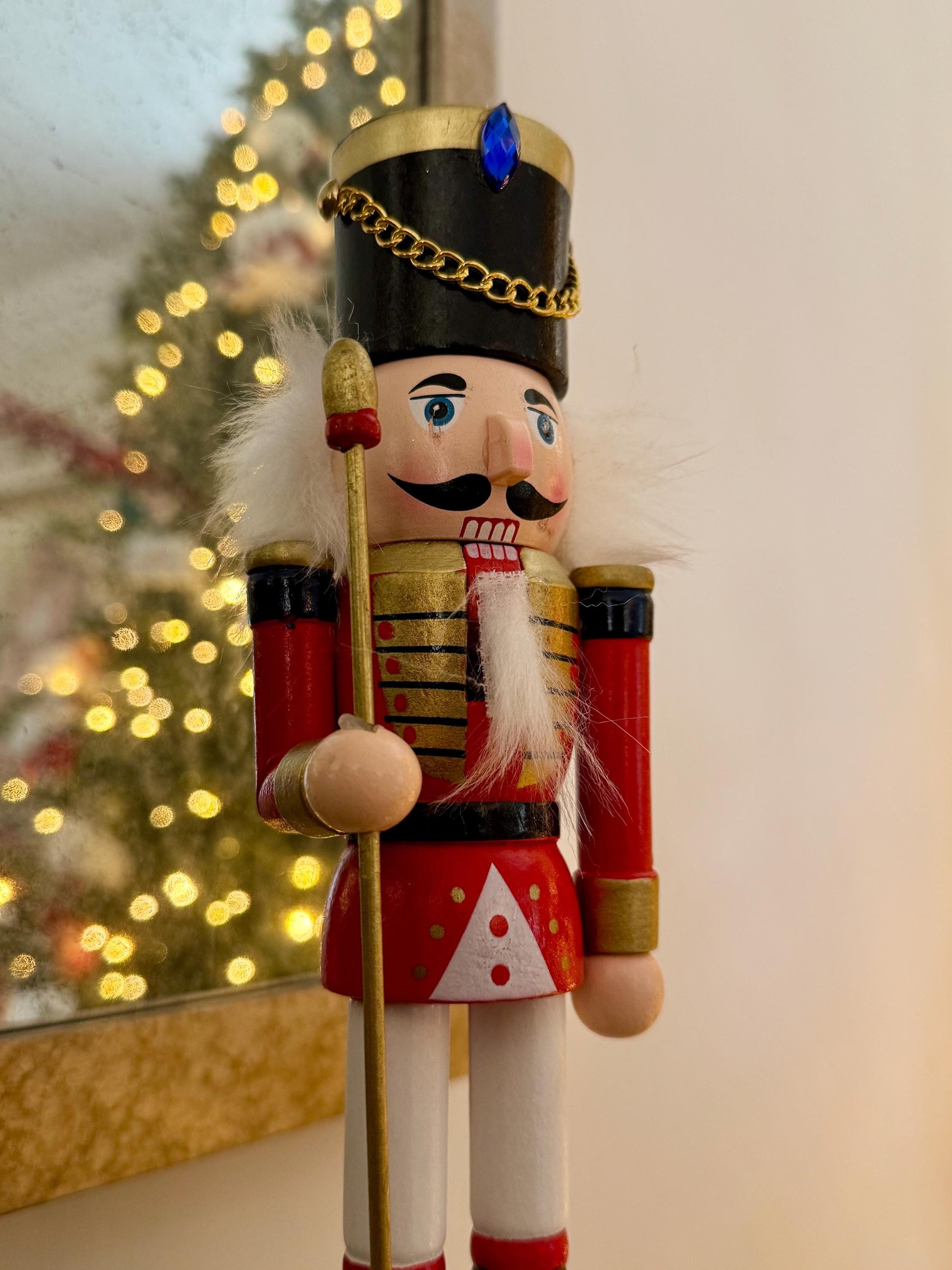 Bring timeless Christmas charm to your home with this 25cm traditional wooden nutcracker soldier. Dressed in a classic red and gold uniform with a tall black hat adorned with a blue jewel and chain detail, this festive figure stands proudly on a sturdy base, holding his staff.