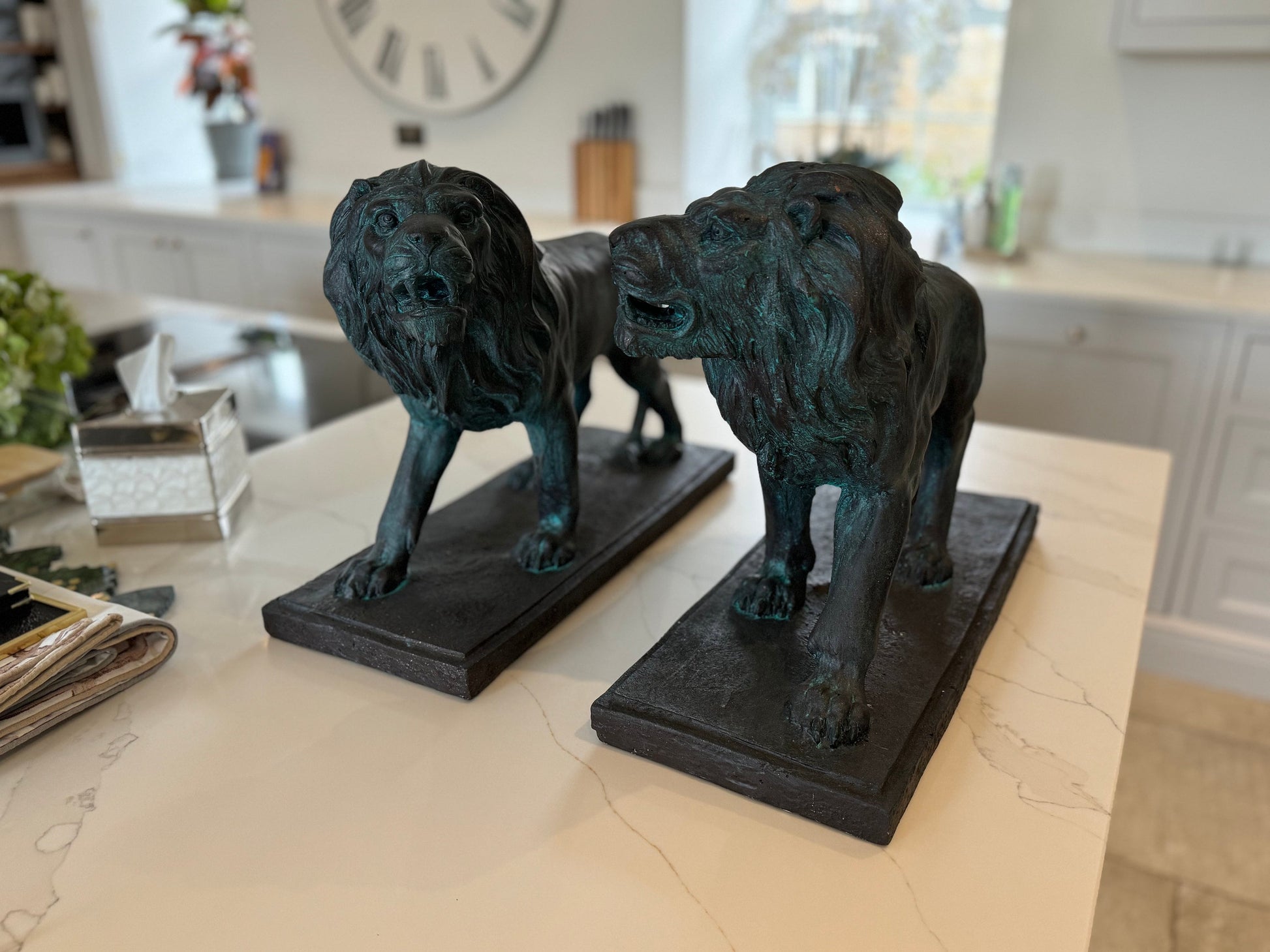 Decorative and striking, this pair of lions provide symmetry and decoration for your home.